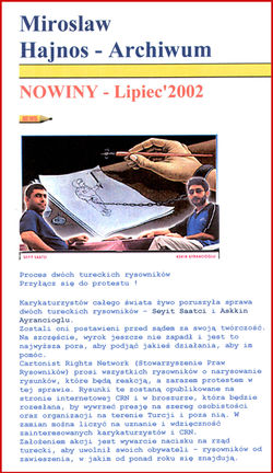 Karikatürist arkadaşlarımız Seyit Saatçi ve Aşkın Ayrancıoğlu’nun 5-9 Haziran 2001 tarihleri arasında Boyabat Halk Kütüphanesi’nde 30’ar karikatürle açtıkları karikatür sergisi 7 Haziran Perşembe günü Cumhuriyet savcısı ve polislerce basılmış ve Ayrancıoğlu’nun 5, Saatçi’nin 2 karikatürüne el konulmuştu. Sanatçılardan Aşkın Ayrancıoğlu ifadesi alınmak üzere karakola çağrılıyor ve böylece “yakalanmış” oluyordu. Seyit Saatçi o sırada Sinop merkezde olduğu için henüz yakalanamamıştı. Cumhuriyet savcısının şifai emirleriyle ev araması da yapan polis, Aşkın Ayrancıoğlu’nun binlerce kitap, dergi, kaset, cd vs. içeren evini “örgüt evi” ele geçirmiş gibi coşku ve hararetle arayarak pek çok dergi, gazete, kitap ve kişisel arşive, Che belgesel video kasetine ve bir de Deniz Gezmiş fotoğrafına “sakıncalı” olduğu gerekçesiyle el koymuştu. Bu ev araması sürerken Sinop’tan gelen Saatçi de içeri girmiş ve gözleri gülümseyen polislerden biri hemen telsize sarılıp; “diğer sanık Seyit Saatçi de kendi ayaklarıyla geldi” diyerek amirini bilgilendirmişti. O akşam, Ayrancıoğlu’nun 23 günlük oğlu Dağlar Umut da polisle tanışmış oluyor ve bu tanışmadan hoşnut olmadığı için sürekli ağlıyordu. Seyit Saatçi’nin evinde yapı-lan aramada ise “sakıncalı” olan tek şey polislerin evdeki varlığı oluyordu. Çünkü Saatçi’nin annesi daha önce geçirdiği beyin felci nedeniyle çok hassas bir konumda yaşamını sürdürürken bu baskın ikinci bir darbe oluyordu.